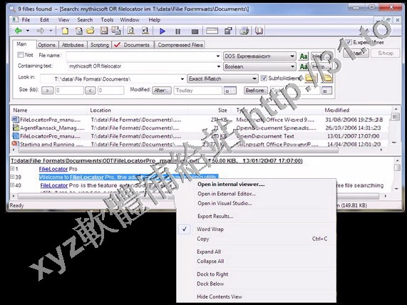 的大量文件中快速的搜索出包含指定文本或者數據的所有文件,支援直接對ZIP壓縮包,DOC文檔格